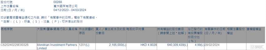 互聯(lián)網(wǎng)3月4日丨根據(jù)聯(lián)交所最新權(quán)益披露資料顯示,2024年2月28日,萬洲國(guó)際(00288.HK)遭Mondrian Investment Partners Limited在場(chǎng)內(nèi)以每股均價(jià)4.8028港元減持218.5萬股,涉資約1049.41萬港元。