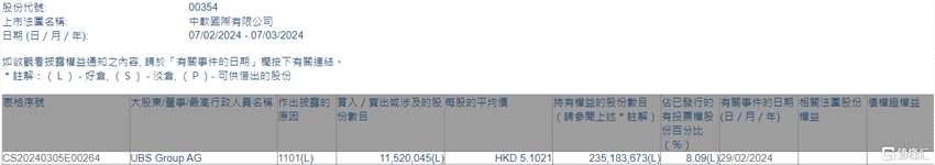 互聯(lián)網(wǎng)3月7日丨根據(jù)聯(lián)交所最新權(quán)益披露資料顯示,2024年2月29日,中國軟件國際(00354.HK)獲UBS Group AG在場內(nèi)以每股均價(jià)5.1021港元增持1152萬股,涉資約5877.64萬港元。
