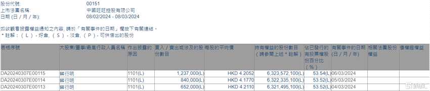 互聯(lián)網(wǎng)3月8日丨根據(jù)聯(lián)交所最新權(quán)益披露資料顯示,2024年3月4日-3月6日,中國(guó)旺旺(00151.HK)獲執(zhí)行董事蔡衍明(主席及行政總裁)在場(chǎng)內(nèi)以每股均價(jià)4.177-4.211港元合計(jì)增持272.9萬(wàn)股,涉資約1145.6萬(wàn)港元。