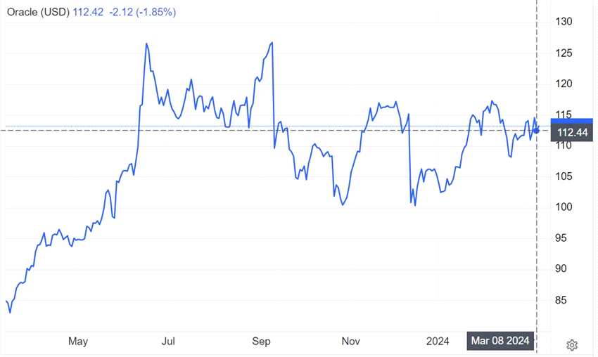 然而,甲骨文的股票價格近期可謂一直處于“恐慌狀態(tài)”,但其第三財季的財務(wù)報告為這家科技巨頭提供了另一個重要機遇,證明自己有潛力成為人工智能領(lǐng)域的贏家。甲骨文當前股價較去年9月時創(chuàng)下的近130美元的六個月最高點下跌了9%。該股在2023年上半年可謂一直在上漲,但是自去年9月以來因連續(xù)兩個季度業(yè)績不及預期而下跌后,長期處于橫盤態(tài)勢,截至周五美股收盤收于112.420美元。
