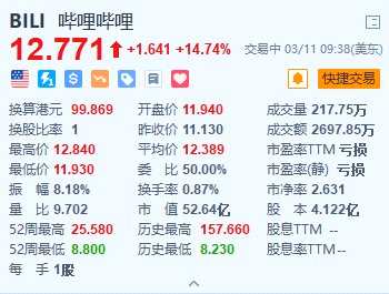 嗶哩嗶哩(BILI.US)漲14.7%,報(bào)12.77美元;H股今日收漲11.6%。嗶哩嗶哩2023年第四季度凈收入63億元,上年同期為61億元;毛利率達(dá)26.1%,較去年同期的20.3%有所增加;日均活躍用戶達(dá)1.001億,較2022年同期增加8%。