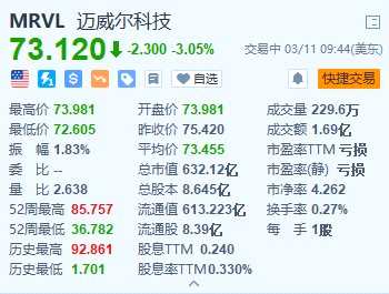 摘要: 來源:互聯(lián)網(wǎng)邁威爾科技(MRVL.US)續(xù)跌超3%,報73.12美元。該股上周五(8日)大幅收跌11.36%。邁威爾科技2023年第四財季凈營收14.3億美元,分析師預(yù)期14.2億美元;每股虧損0.4