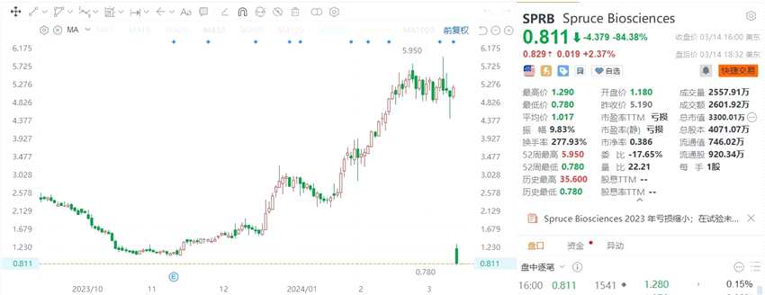 摘要: 來源:互聯(lián)網(wǎng)生物制藥公司SpruceBiosciencesInc.(SPRB.US)收跌超84%,報0.811美元,總市值3300萬美元。消息上,近日該公司宣布,