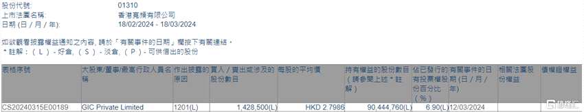 香港寬頻(01310.HK)遭GIC Private Limited減持142.85萬股