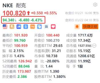 摘要: 互聯網3月22日|耐克(NKE.US)美股盤前跌6.43%,報94.34美元。耐克第三財季營收為124.3億美元,同比增長0.3%;凈利潤11.72億美元,同比減少5%;毛利率為44.8%,