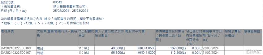 摘要: 互聯(lián)網(wǎng)3月25日丨根據(jù)聯(lián)交所最新權(quán)益披露資料顯示,2024年3月21日-3月22日,遠(yuǎn)大醫(yī)藥(00512.HK)獲執(zhí)行董事周超在場(chǎng)內(nèi)以每股均價(jià)4.03-4.05港元合計(jì)增持10.6萬(wàn)股,