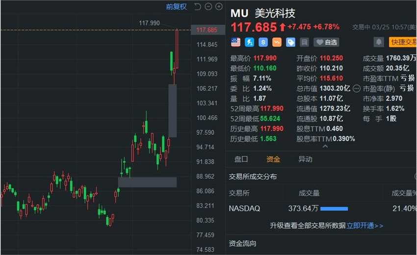 美光科技大漲近7%創(chuàng)新高 市值超1300億美元