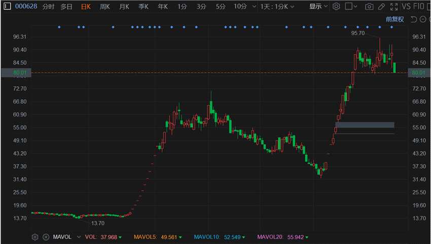 高新發(fā)展(000628.SZ)跌停,報80.1元,總市值281.9億元。該股近期持續(xù)上漲,股價最高翻近3倍。昨日龍虎榜數(shù)據(jù)顯示,“屠文斌”為賣四席位,凈賣出1.21億元;四家機構(gòu)買入1.41億元同時賣出3.55億元,凈賣出2.15億元。