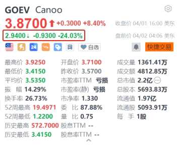摘要: 電動汽車制造商Canoo(GOEV.US)美股盤前大跌超24%,報2.94美元。Canoo公布截至12月31日的第四季度業(yè)績,營收為36.7萬美元,低于分析師預(yù)期的70萬美元;調(diào)整后每股虧損為1.73