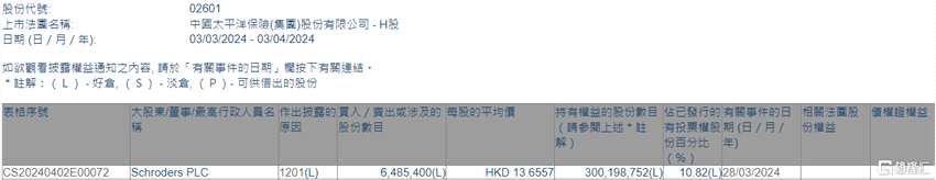 中國太保(02601.HK)遭Schroders PLC減持648.54萬股