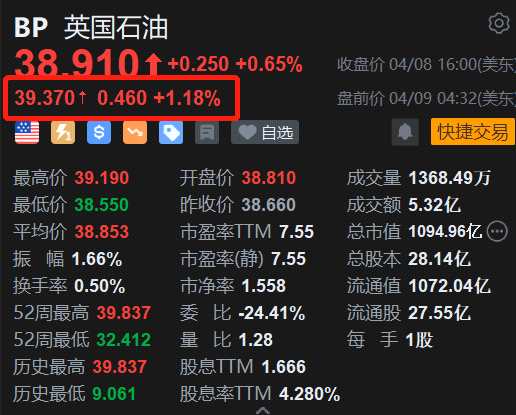 英國(guó)石油盤前漲超1% 料首季石油買賣業(yè)績(jī)顯著改善