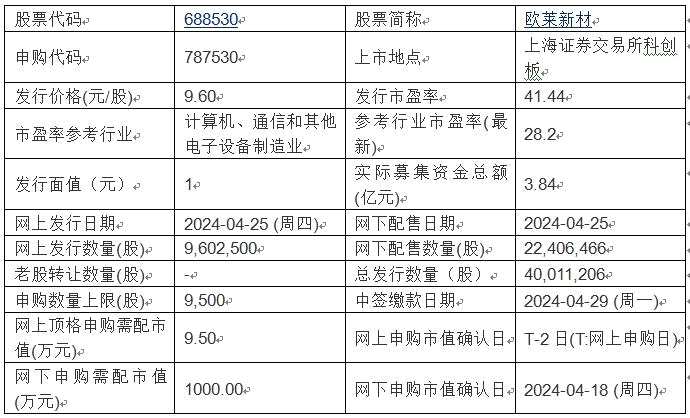 歐萊新材(688530.SH)今日申購(gòu),申購(gòu)代碼為787530,發(fā)行價(jià)格為9.6元/股,發(fā)行市盈率41.44倍,單一賬戶申購(gòu)上限9500股,頂格申購(gòu)需配市值9.5萬(wàn)元。