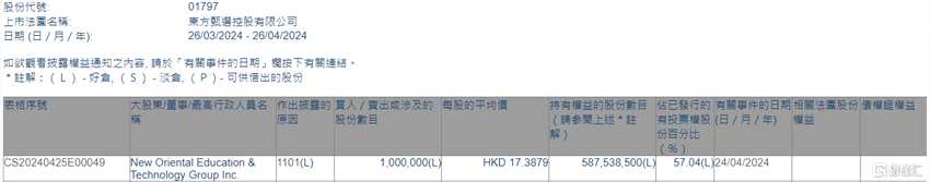 4月26日丨根據(jù)聯(lián)交所最新權(quán)益披露資料顯示,2024年4月24日,東方甄選(01797.HK)獲New Oriental Education & Technology Group Inc.在場(chǎng)內(nèi)以每股均價(jià)17.3879港元增持100萬(wàn)股,涉資約1738.79萬(wàn)港元。