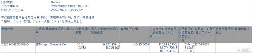 摘要: 4月26日丨根據(jù)聯(lián)交所最新權(quán)益披露資料顯示,2024年4月22日,長城汽車(02333.HK)獲JPMorganChase&Co.以每股均價(jià)10.3687港元增持好倉695.73萬股,