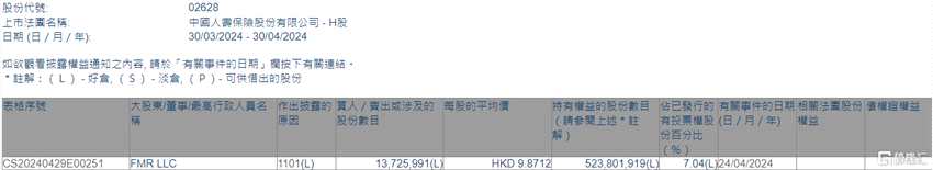 4月30日丨根據(jù)聯(lián)交所最新權(quán)益披露資料顯示,2024年4月24日,中國(guó)人壽(02628.HK)獲FMR LLC在場(chǎng)內(nèi)以每股均價(jià)9.8712港元增持1372.6萬股,涉資約1.35億港元。