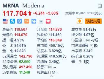Moderna漲5.6% 第一季度業(yè)績超預期 重申今年營收指引
