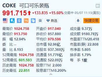 摘要: 5月7日|可口可樂裝瓶(COKE.US)盤初一度大漲超19%,最高觸及1024.758美元,創(chuàng)歷史新高;現(xiàn)漲幅收窄至15.6%??煽诳蓸费b瓶2024年第一季度的凈銷售額同比增長1.3%,