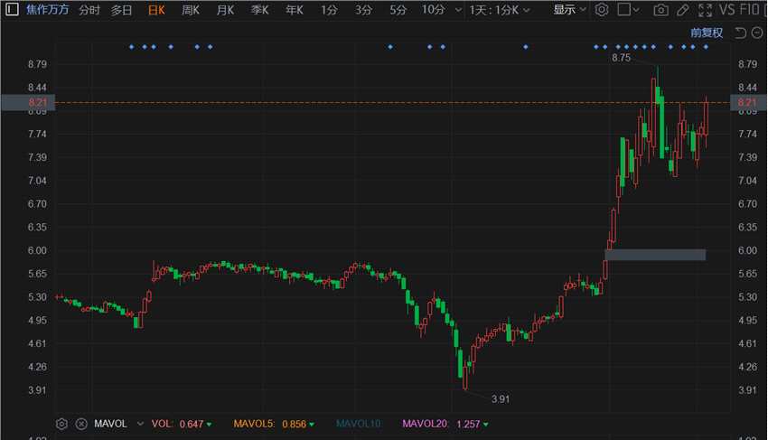 摘要: 5月8日|焦作萬方(000612.SZ)漲超5%報(bào)8.24元,總市值近100億元?;趯疚磥戆l(fā)展前景的信心和對公司長期價(jià)值的合理判斷,安晟控股于2024年5月6日通過大宗交易方式買入2384.39