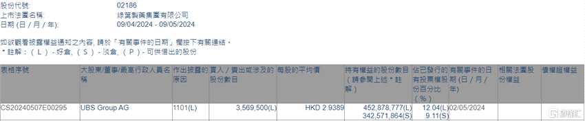 5月9日丨根據(jù)聯(lián)交所最新權(quán)益披露資料顯示,2024年5月2日,綠葉制藥(02186.HK)獲UBS Group AG在場(chǎng)內(nèi)以每股均價(jià)2.9389港元增持好倉(cāng)356.95萬(wàn)股,涉資約1049萬(wàn)港元。