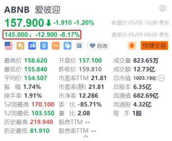 摘要: 5月9日|愛(ài)彼迎(ABNB.US)美股盤前跌8.17%,報(bào)145美元。愛(ài)彼迎第一季度營(yíng)收21.4億美元,同比增長(zhǎng)18%,分析師預(yù)期20.6億美元;每股收益0.41美元,市場(chǎng)預(yù)期0.24美元,