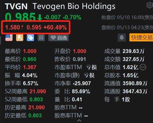 5月13日|生物醫(yī)藥公司Tevogen Bio盤前漲60.49%,報(bào)1.58美元。消息上,近日,公司完成戰(zhàn)略投資,將進(jìn)一步加速生物制藥研發(fā)進(jìn)程。公司稱已與一家現(xiàn)有投資者簽訂了一份具有約束力的投資協(xié)議,以獲得高達(dá)5000萬美元的融資。這筆融資包括3600萬美元的信貸額度和1400萬美元的私募。預(yù)計(jì)融資將在第二季度末結(jié)束。