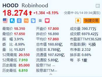 5月14日|受WSB概念股連續(xù)兩日飆漲帶動,Reddit(RDDT.US)漲超9%,報63.46美元。這家社交媒體公司在2021年被散戶投資者用來協(xié)調(diào)和瞄準(zhǔn)高度做空的股票。以散戶投資者為主的經(jīng)紀(jì)商Robinhood(HOOD.US)漲超8%,報18.27美元,該公司使零傭金交易成為主流。