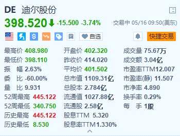 5月16日|迪爾股份(DE.US)跌3.74%,報398.52美元。迪爾股份公布截至4月28日的第二財季業(yè)績,營收為136.1億美元,同比下滑超15%,但高于市場預(yù)期的133.2億美元;每股收益為8.53美元,低于去年同期的每股9.65美元,市場預(yù)期為7.92美元。