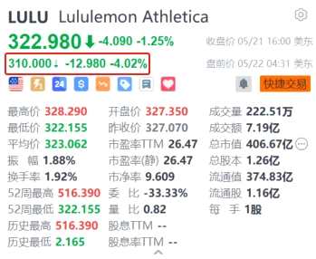 摘要: 5月22日|LululemonAthletica(LULU.US)美股盤前跌超4%,報(bào)310美元。消息面上,Lululemon周二晚間表示,在其首席產(chǎn)品官SunChoe離職后,