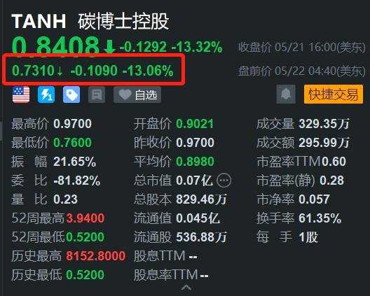 5月22日|昨日跌超13%的碳博士控股(TANH.US)盤前再度下跌13%。消息上,公司于2024年5月20日收到納斯達(dá)克股票市場有限公司的不遵守通知,稱由于沒有及時提交截至2023年12月31日的年度報(bào)表20-F。