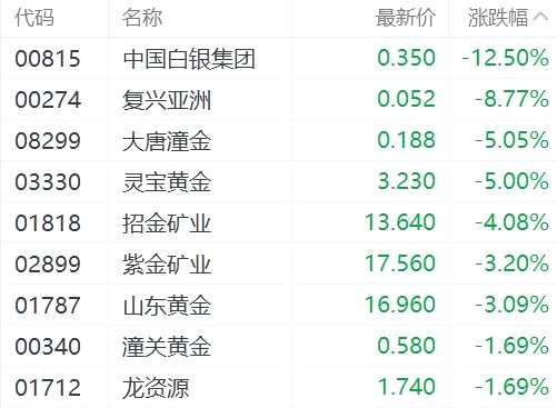 摘要: 金銀價(jià)格大幅下挫,拖累港股市場(chǎng)相關(guān)概念股走低。其中,中國(guó)白銀集團(tuán)跌超12%,大唐潼金、靈寶黃金跌超5%,招金礦業(yè)跌4%,