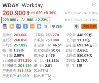 摘要: 5月24日|人力資源軟件提供商Workday(WDAY.US)美股盤前跌12.23%,報(bào)229美元。Workday第一季度營收從去年同期的16.8億美元增至19.9億美元,