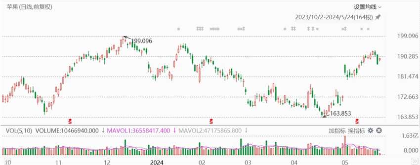 5月24日|蘋果(AAPL.US)漲1.49至189.66美元。消息面上,投行Wedbush分析師Dan Ives將蘋果目標(biāo)價從250 美元上調(diào)至275美元,主因考慮到由人工智慧技術(shù)驅(qū)動iPhone 16超級周期,將讓公司價值增加30至40美元/股。他還強調(diào),即將到來的全球開發(fā)者大會(WWDC)是公司的關(guān)鍵時刻。
