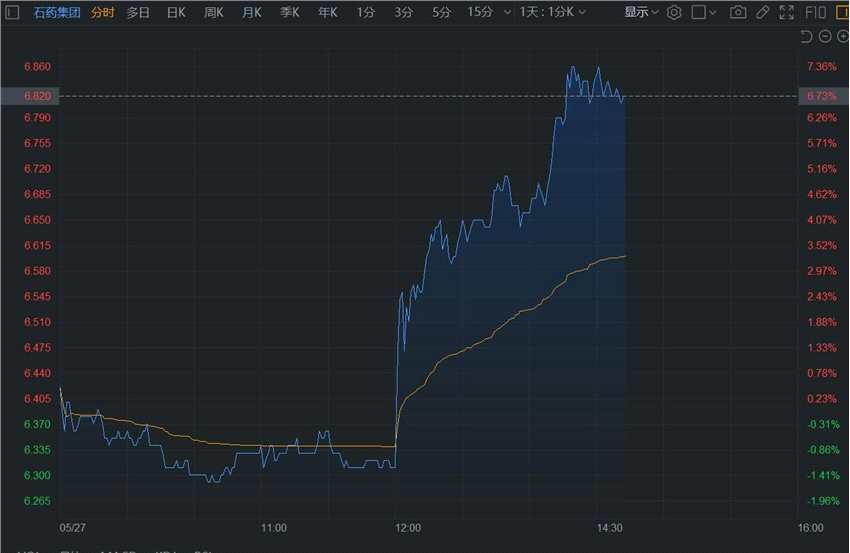 5月27日|受業(yè)績增長影響,石藥集團(tuán)(1093.HK)午后開盤直線拉升,目前漲幅擴(kuò)大至超7%,報(bào)6.83港元,總市值810億港元。公司午間公告,一季度營業(yè)額89.83億元人民幣(下同),同比增長11.5%;純利16.13億元,同比增長12.9%。