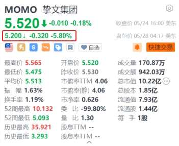 摘要: 5月28日|摯文集團(tuán)(MOMO.US)美股盤前跌5.8%,報5.2美元。摯文集團(tuán)第一季度銷售額3.546億美元,市場預(yù)期3.48億美元;調(diào)整后每ADS盈利0.04美元,遠(yuǎn)不及市場預(yù)期的0.29美元。