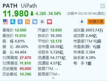 摘要: 企業(yè)自動化軟件公司UiPath(PATH.US)暴跌超34%,最低觸及11.81美元,創(chuàng)2023年1月以來新低。UiPath第一季度營收為3.351億美元,分析師預(yù)期3.332億美元;調(diào)整后每股收益為
