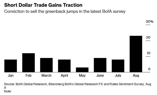 美國銀行的一項調(diào)查顯示,在市場準(zhǔn)備迎接美聯(lián)儲降息之際,相信美元將走軟的投資者比例在過去一個月幾乎增加了兩倍。在美銀的月度情緒調(diào)查中,約23%的受訪者表示,他們最確信的交易是做空美元,這是今年以來的最高比例,高于7月的8%。