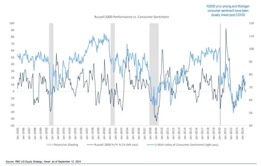 Lori Calvasina還表示,密歇根大學(xué)9月消費者信心指數(shù)初值較上月上升,這是羅素2000指數(shù)保持活力所必需的。他表示:“這對股市總體來說是個好消息,尤其是對小盤股來說,它們與后疫情時代的消費者信心趨勢密切相關(guān)?!?/p>