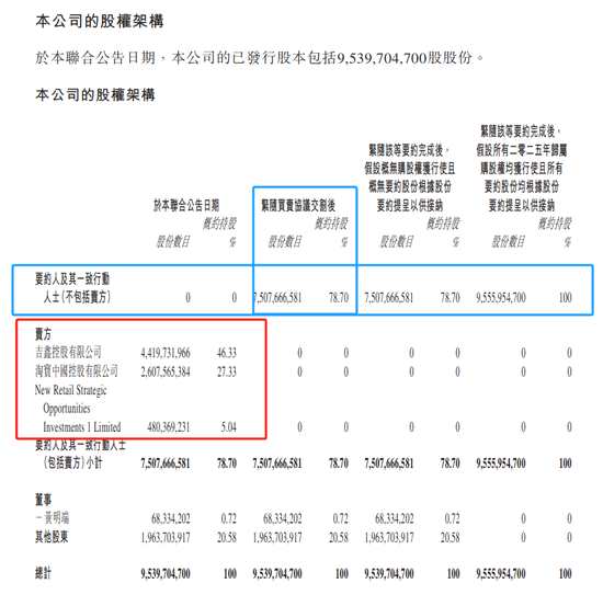 公告指,買方同意購買阿里巴巴子公司阿里巴巴待售股份(占公告日期已發(fā)行高鑫零售股份總數(shù)約73.66%)以及向NewRetail 購買4.8億股高鑫零售股份(占公告日期已發(fā)行高鑫零售股份總數(shù)約 5.04%),合計占高鑫零售已發(fā)行股份總數(shù)約78.7%。