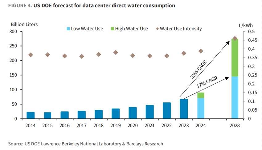 此外,美國能源部還預(yù)計,未來幾年美國數(shù)據(jù)中心的用水量增長將超過電力需求增長。目前,目前,直接用水量已經(jīng)從2014年的210億升飆升至2023年的660億升,到2028年預(yù)計將增長約2-4倍。