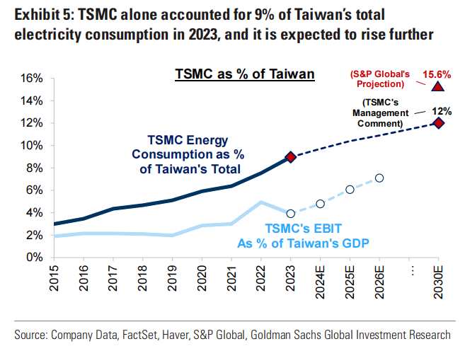 除此之外,之前在“科技股人手一個小型核反應(yīng)堆?”里提到過。2023年,僅臺積電一家公司就占臺灣電力消耗的9%,單獨占臺灣工業(yè)部門需求的16%,高于2019年的5.1%。相比之下,半導體產(chǎn)業(yè)消耗了臺灣電力的13.4%,高于2019年的8.4%。