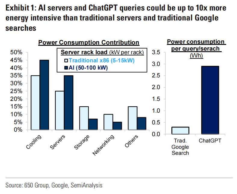 在去年,谷歌的Claude和ChatGPT開放了聯(lián)網(wǎng)搜索功能,根據(jù)高盛預(yù)計,隨著其他互聯(lián)網(wǎng)產(chǎn)品增多AI搜索,這可能會帶來很大的能源消耗。例如,ChatGPT單條搜索問答估計會比傳統(tǒng)谷歌搜索多消耗6-10倍的能源需求。