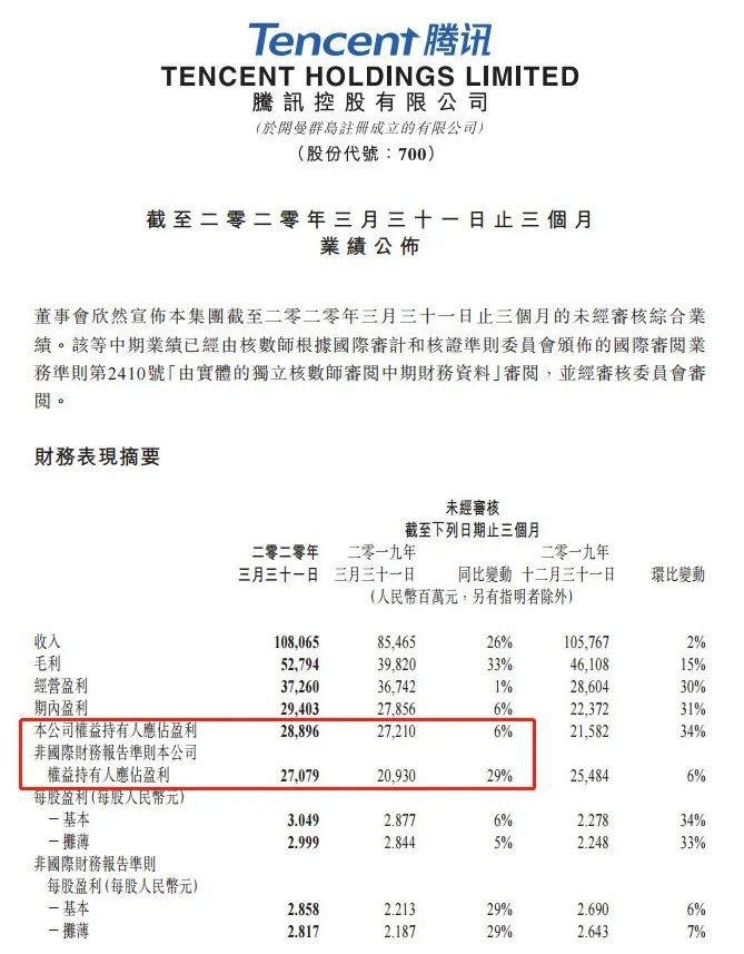 5月13日,騰訊披露一季報,總收入突破千億元達到1080.65億元,同比增長26%,凈利潤289億元,同比增長6%,意味著每天凈賺3.2億元;而若按照非國際財務(wù)報告準(zhǔn)則,凈利潤達到270.79億元,同比大增29%。