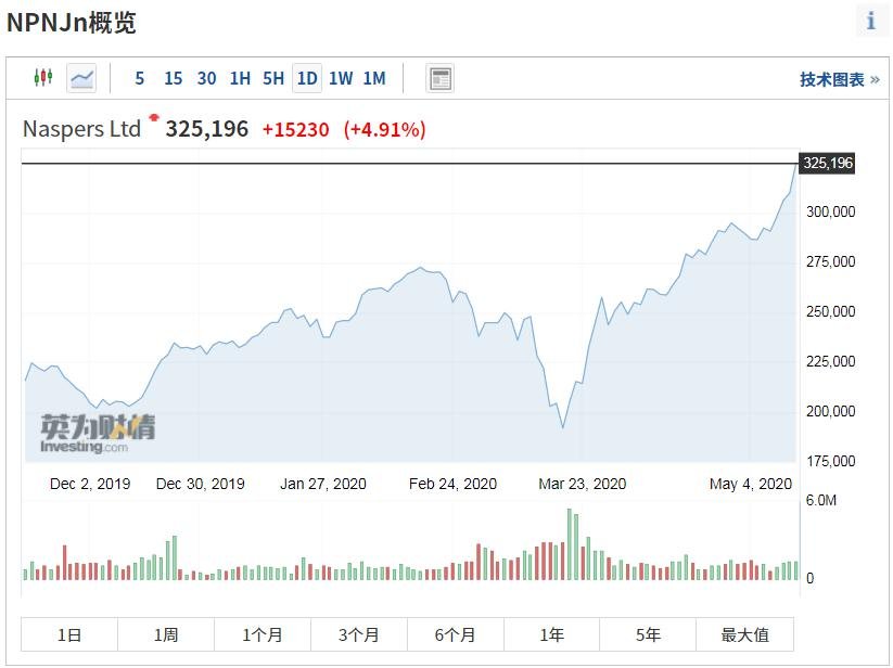 受益于騰訊業(yè)績超預(yù)期增長,騰訊控股ADR盤中大漲近6%。而騰訊的大股東Naspers漲幅接近5%,股價刷新歷史紀(jì)錄。