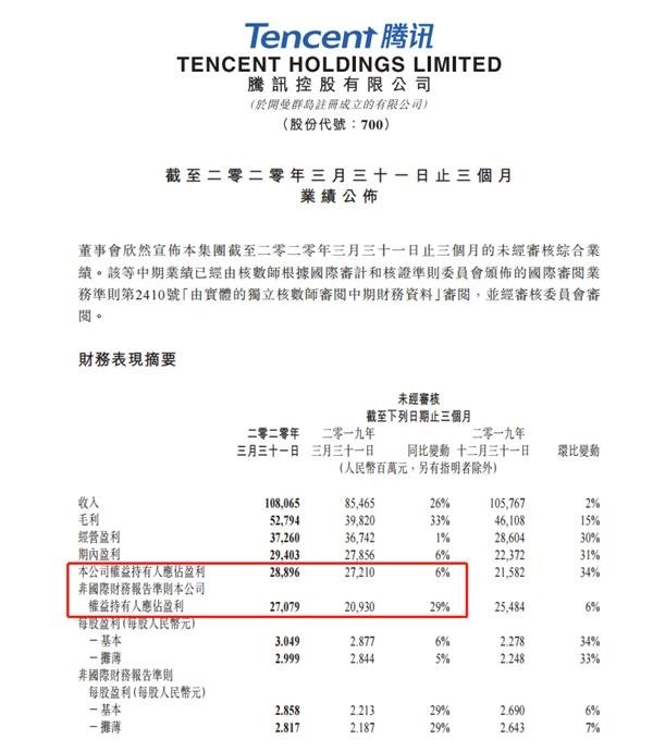 5月13日,騰訊披露一季報(bào),總收入突破千億元達(dá)到1080.65億元,同比增長(zhǎng)26%,凈利潤(rùn)289億元,同比增長(zhǎng)6%,意味著每天凈賺3.2億元;而若按照非國(guó)際財(cái)務(wù)報(bào)告準(zhǔn)則,凈利潤(rùn)達(dá)到270.79億元,同比大增29%。