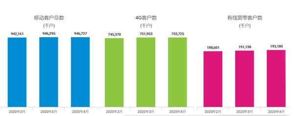 數(shù)據(jù)顯示,2020年4月份,中國移動用戶總數(shù)達到9.46727億戶,當月凈增客戶數(shù)43.2萬戶。中國移動4G客戶數(shù)達到7.53725億戶,當月凈增177.2萬戶。有線寬帶方面,中國移動有線客戶總數(shù)達到1.9318億戶,當月凈增客戶數(shù)204.2萬戶。