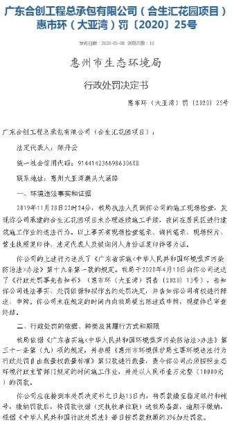 惠州合生匯花園夜間違法施工遭罰 為合生創(chuàng)展旗下項(xiàng)目