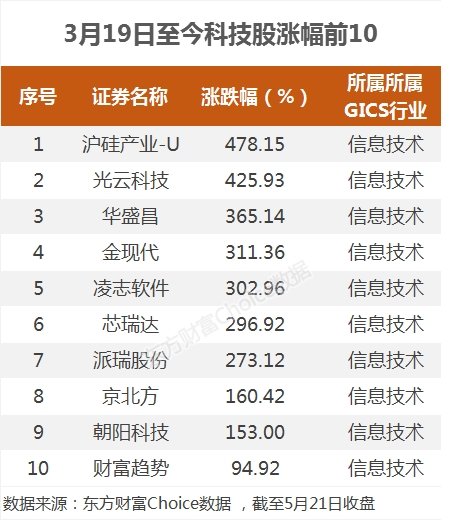 以3月19日為起始時(shí)間,據(jù)東方財(cái)富Choice數(shù)據(jù)顯示,A股超四成科技股錄得上漲,其中9只股票漲幅超一倍。