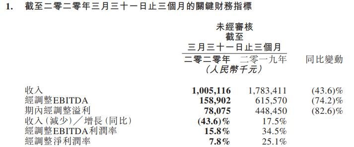 期內(nèi)經(jīng)調(diào)整溢利由2019年同期的人民幣4.49億元同比減少82.6%至人民幣7808萬元。經(jīng)調(diào)整凈利潤率由2019年同期的25.1%下降至7.8%。