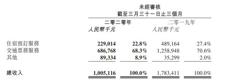 住宿預(yù)訂服務(wù)的收入由截至2019年3月31日止3個(gè)月的人民幣4.89億元減少53.2%至截至2020年3月31日止3個(gè)月的人民幣2.29億元。