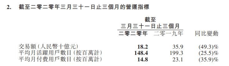 平均月付費(fèi)用戶由2019年同期的2310萬人次同比減少35.9%至1480萬人次。